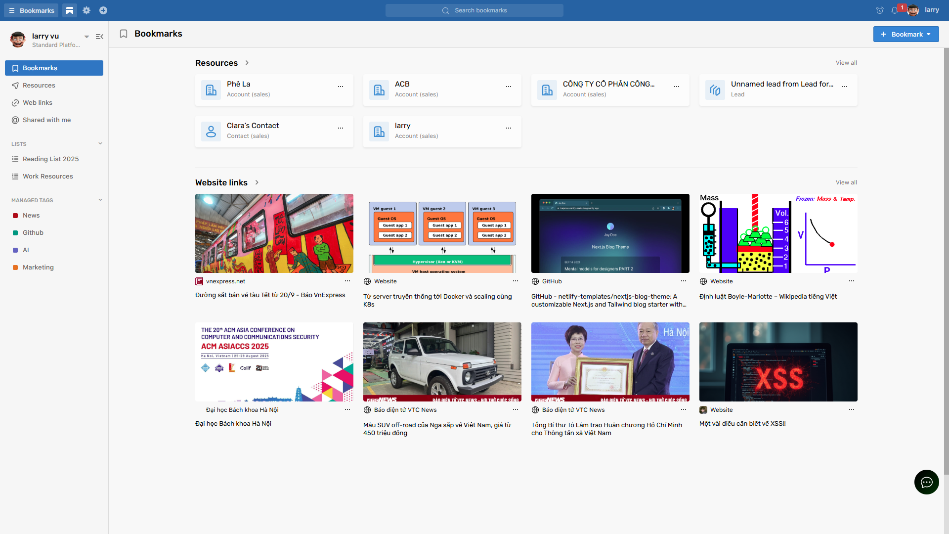 Ứng dụng quản lý bookmarks đa dạng: từ link ngoài đến resource nội bộ, kèm AI hỗ trợ extract & summary.